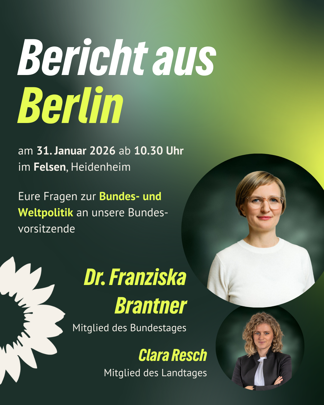 Am kommenden Samstag findet in Heidenheim im Felsen der „Bericht aus Berlin“ mit unserer Bundesvorsitzenden Dr. Franziska Brantner, MdB statt. Nach einem kurzen Einstieg durch unsere Landtagsabgeordnete Clara Resch gibt Franziska Brantner einen umfassenden Einblick in die aktuelle politische Lage auf Bundesebene und in der internationalen Politik.