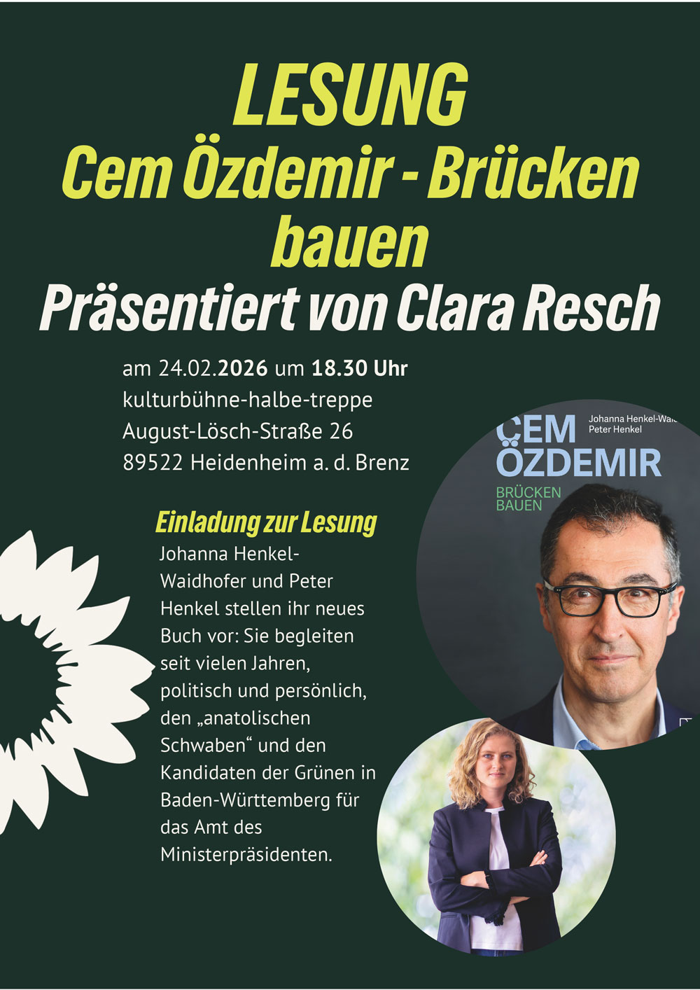 Die Autor*innen Johanna Henkel-Waidhofer und Peter Henkel präsentieren ihr neues Buch über Cem Özdemir. Seit vielen Jahren begleiten sie den „anatolischen Schwaben“ journalistisch wie persönlich – und zeichnen ein facettenreiches Porträt unseres Kandidaten für das Amt des Ministerpräsidenten.Der Abend bietet spannende Einblicke in politische Wegmarken, persönliche Prägungen und die Frage, wie Brücken in einer vielfältigen Gesellschaft gelingen können.